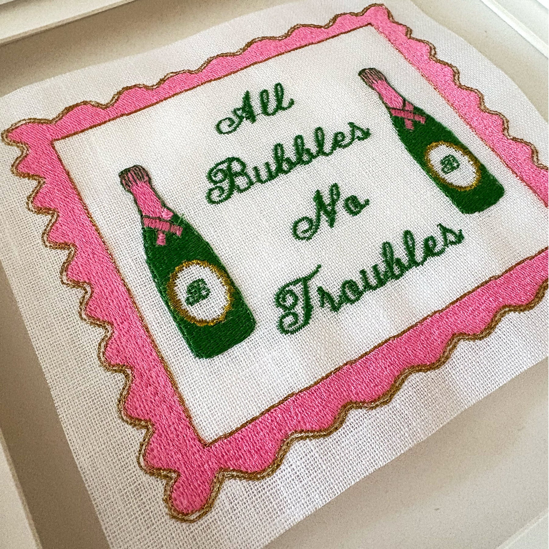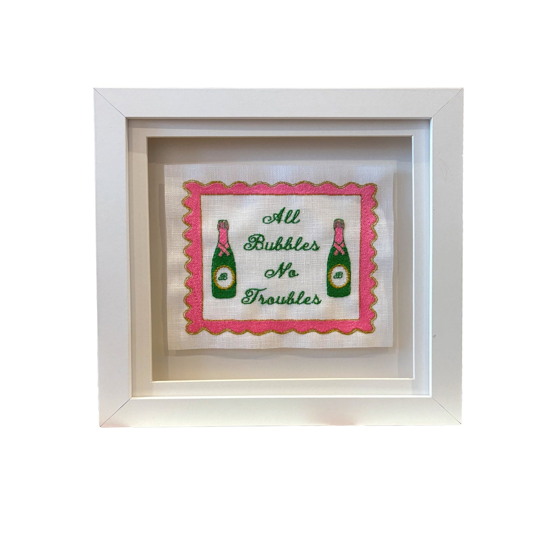 Hello, I’m Emma, the owner of Lilly Loves - an embroidery studio based in London. All Bubbles No Troubles Embroidered Artwork are bright and fun with a playful twist. We stitch all of these in our London studio and use beautiful floating frames. These are perfect for any library picture wall or on their own. Fun and quirky, guaranteed to make you smile. 10"x10" inches 3D Deep Box Frame.