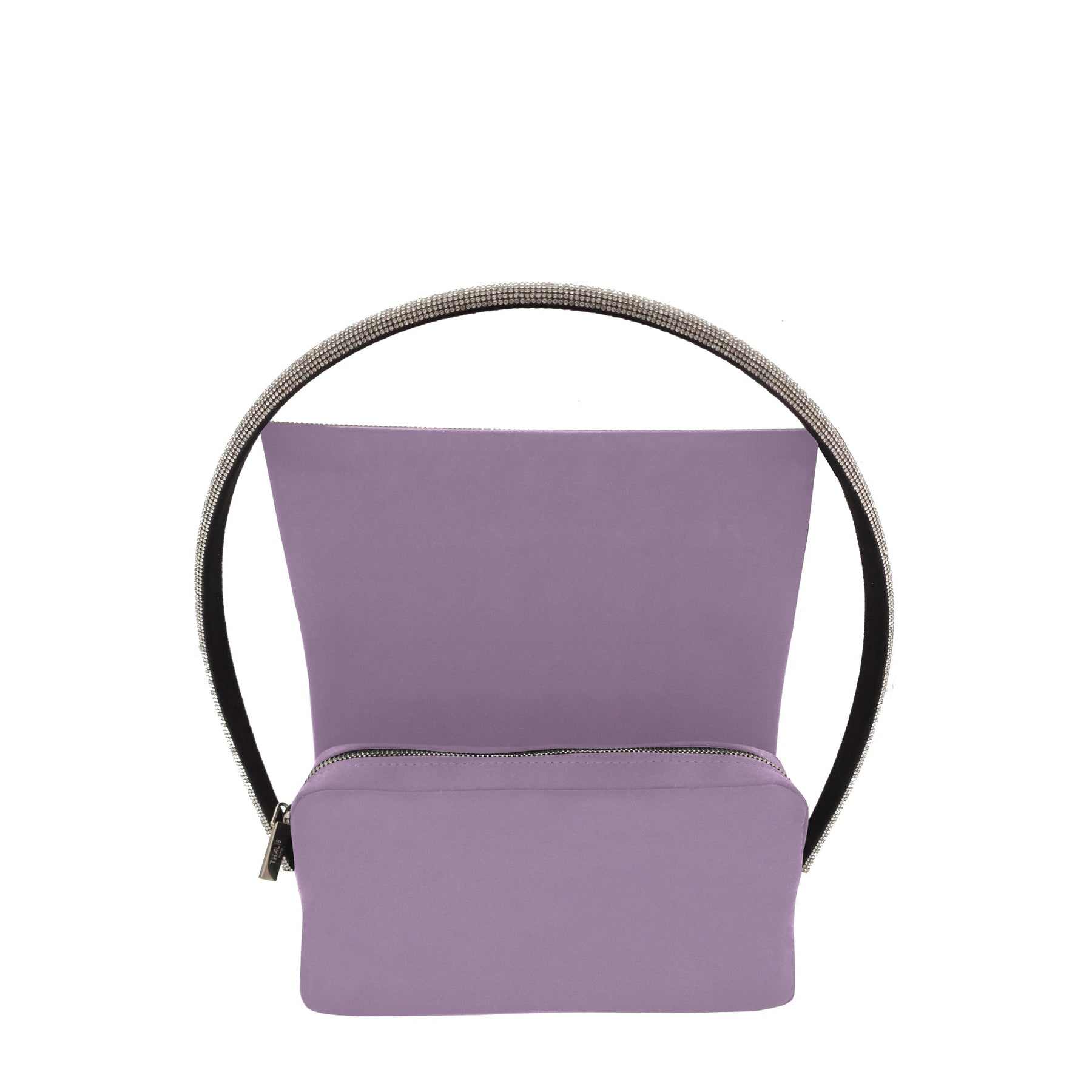 Ava amethyst satin shoulder bag with crystal pavé handle, evening purse handmade in Italy. Thalie Paris