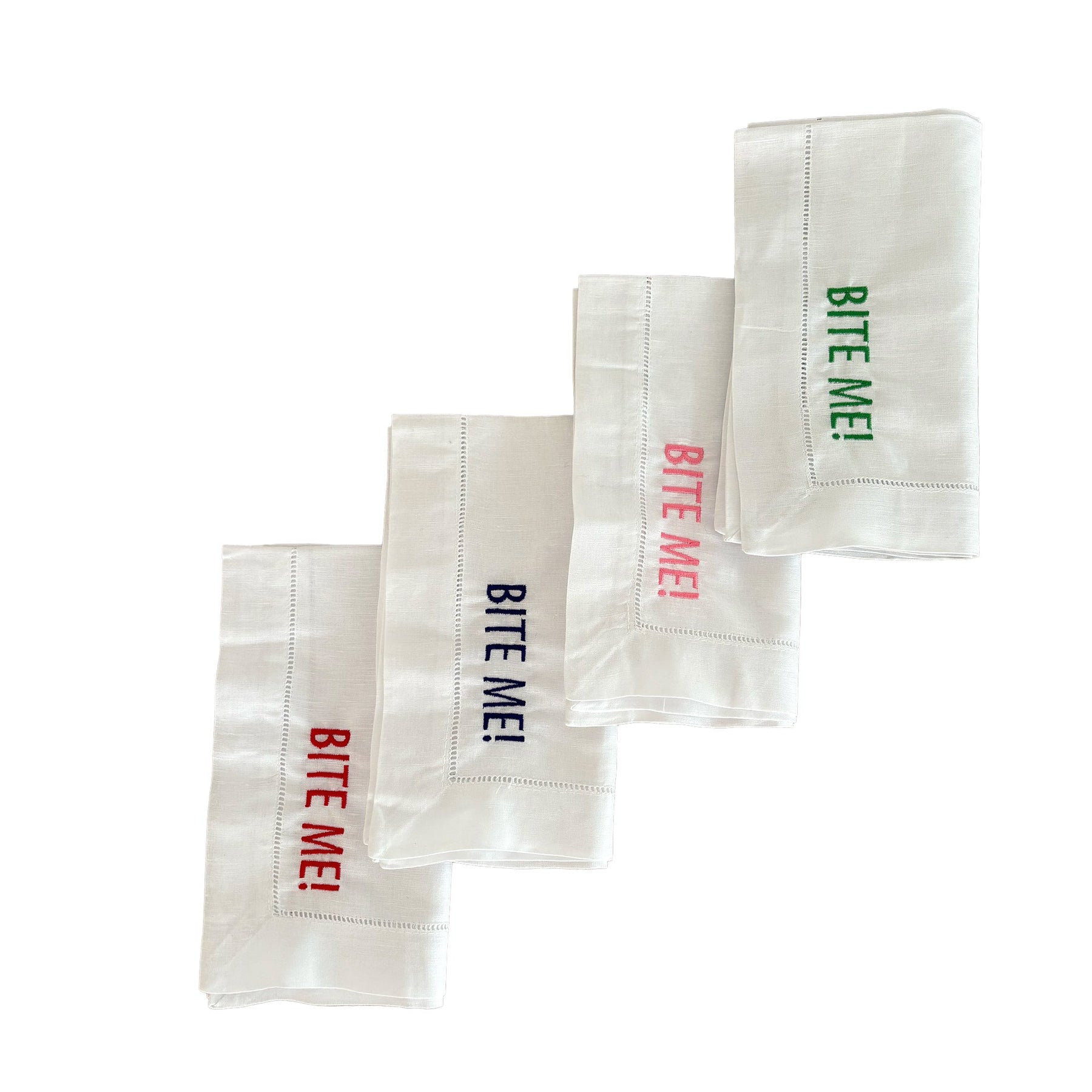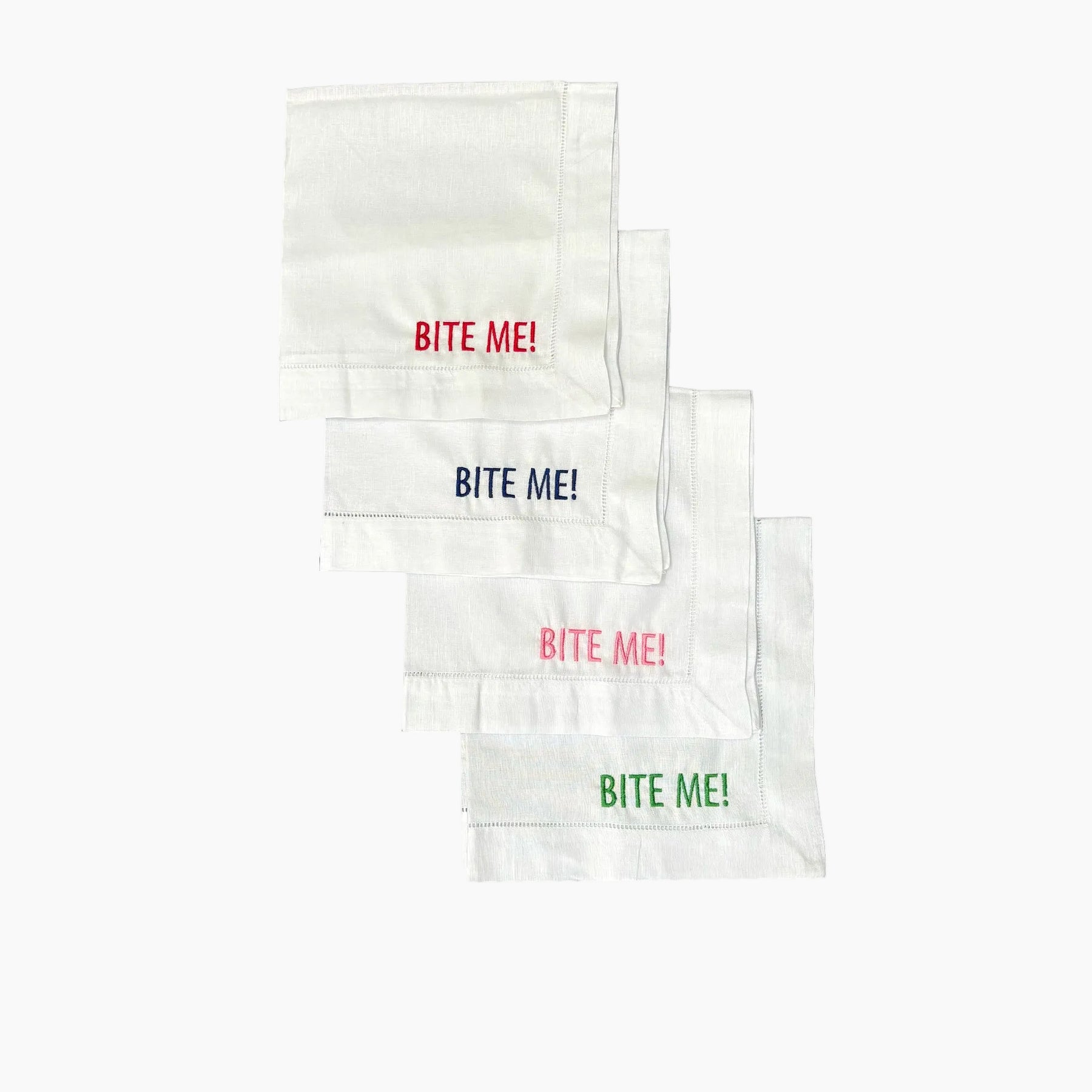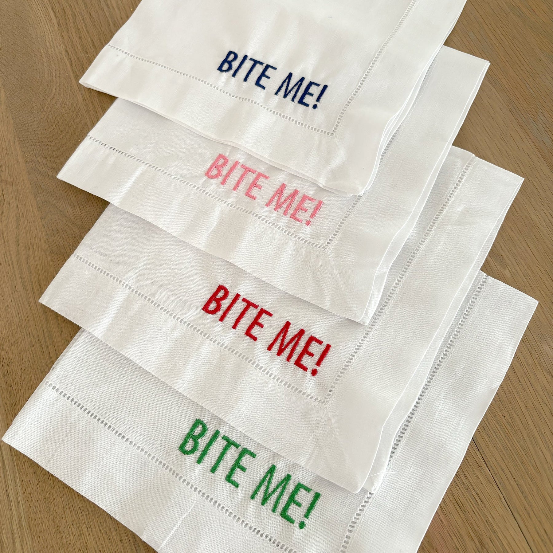 Add a touch of humour and personalisation to your housewarming Bite Me! Each napkin is embroidered. Perfect for entertaining, each 100% linen napkin has a soft, absorbent texture ideal for napkins or kitchen napkin. The embroidery is expertly stitched for lasting quality. A clever and practical gift to embrace the newlywed or new homeowner life!