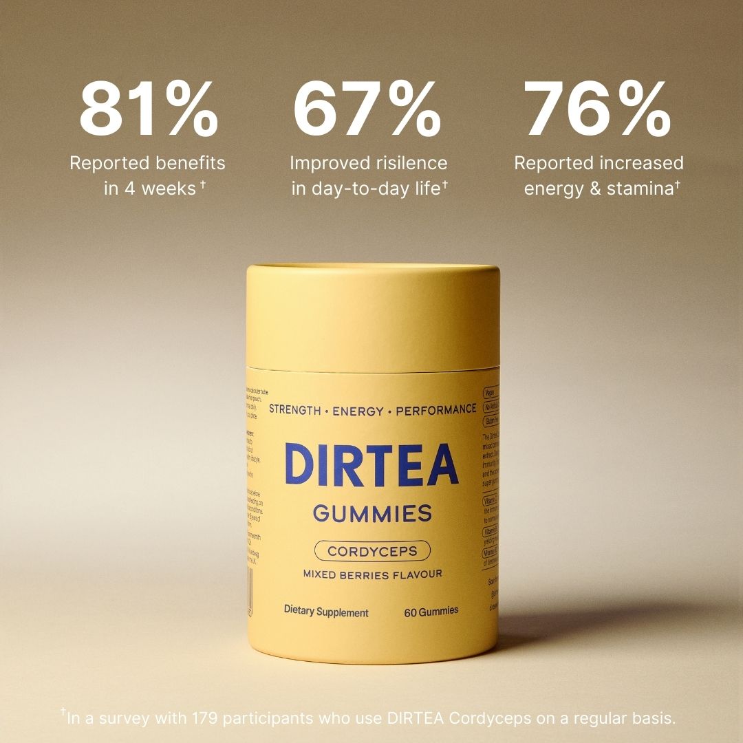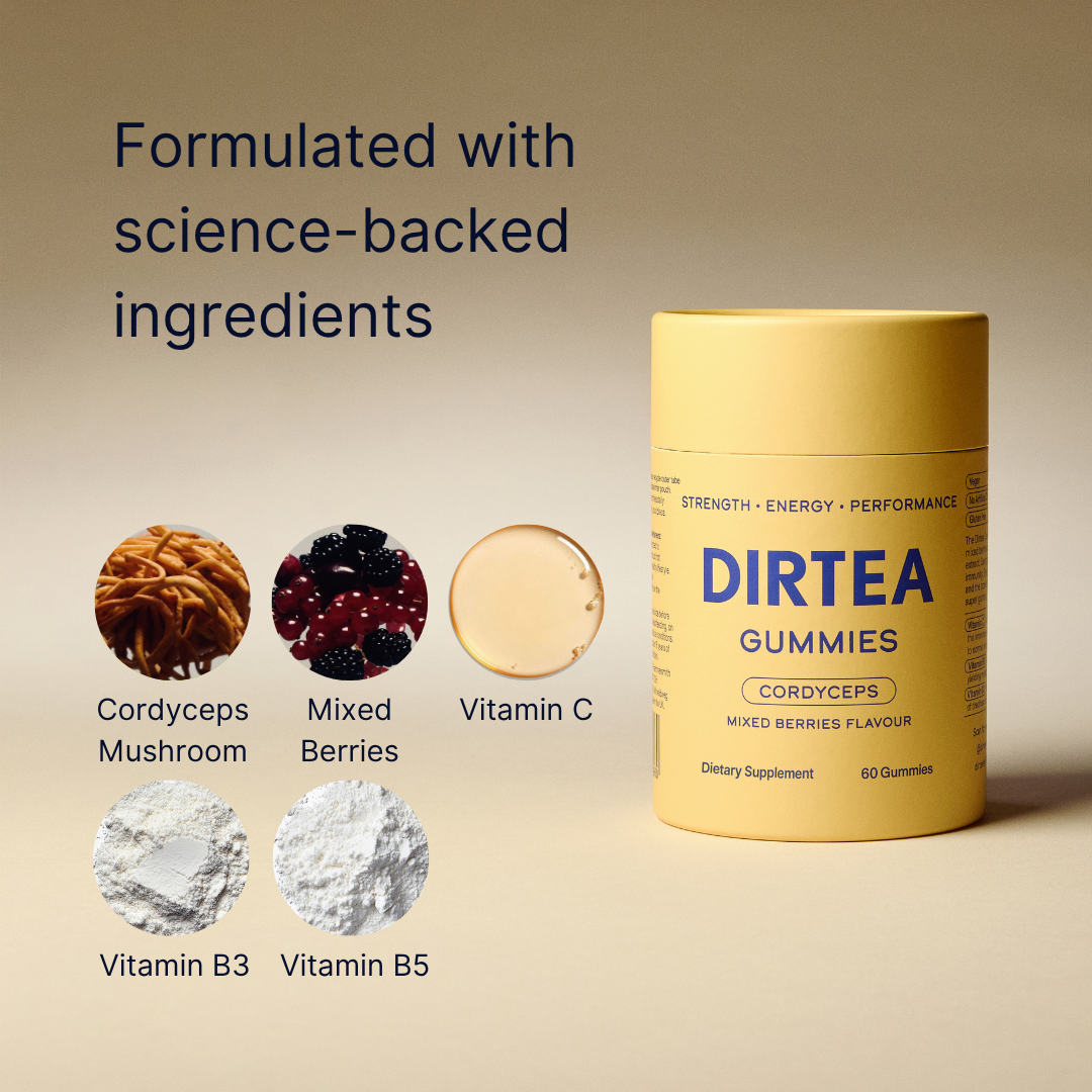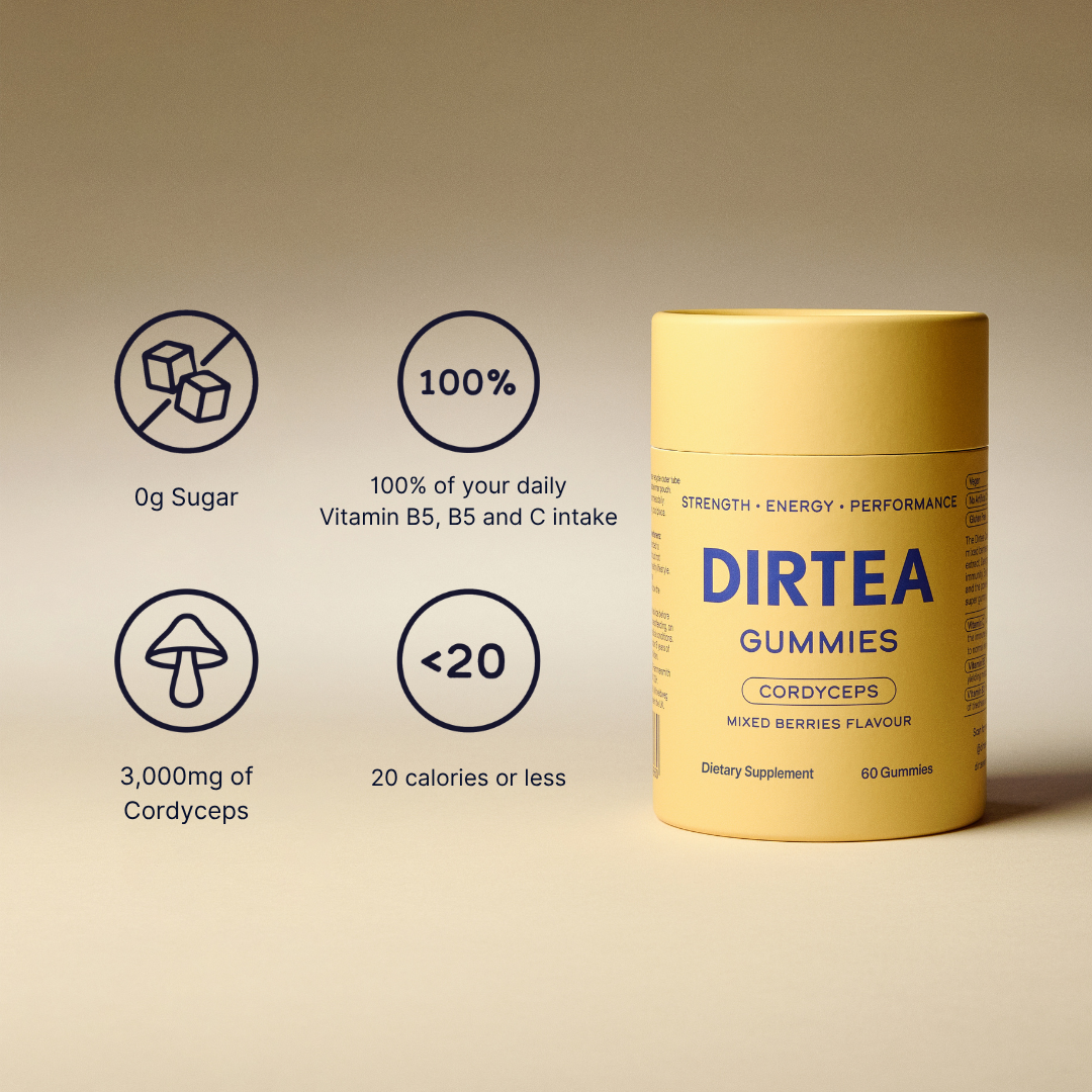 DIRTEA Cordyceps Gummies, with zero sugars and natural flavours, deliver natural strength and energy in every bite.