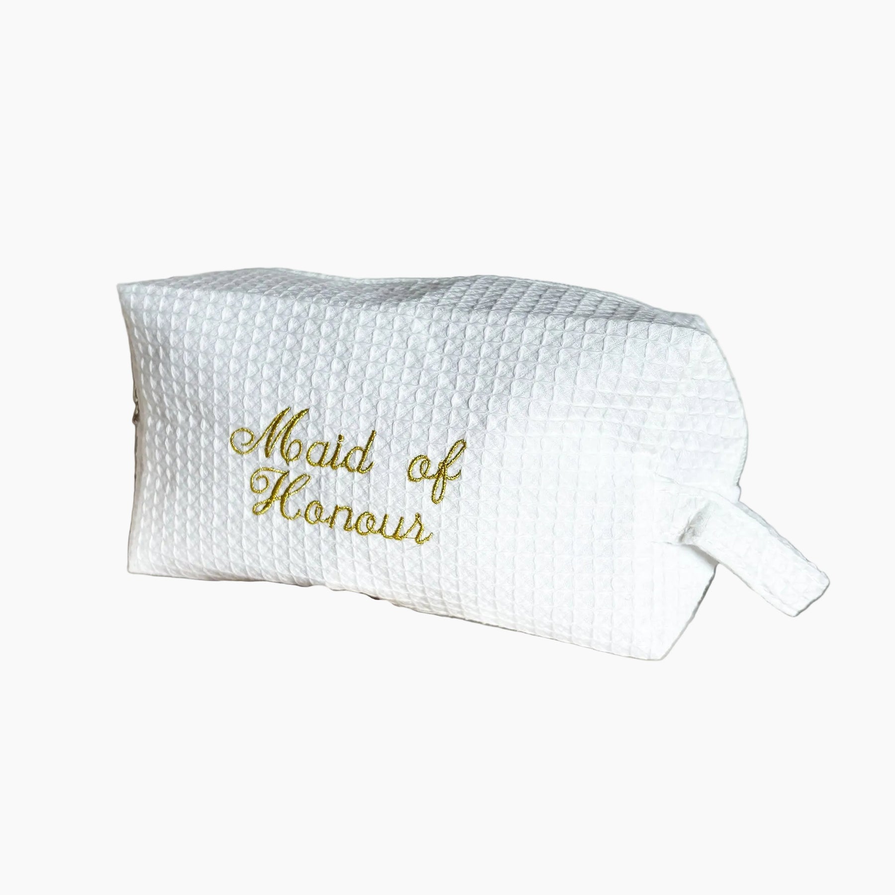 Elevate your bridal beauty routine with this charming white waffle makeup bag—the perfect companion for getting ready on your big day. Soft, textured fabric keeps your essentials organized while adding a touch of elegance to your vanity. Whether you're a bride-to-be or searching for a thoughtful gift for someone special, this customizable bag makes a memorable keepsake. Ideal for honeymoons, bridesmaids' gifts, or simply treating yourself to something wonderfully unique.