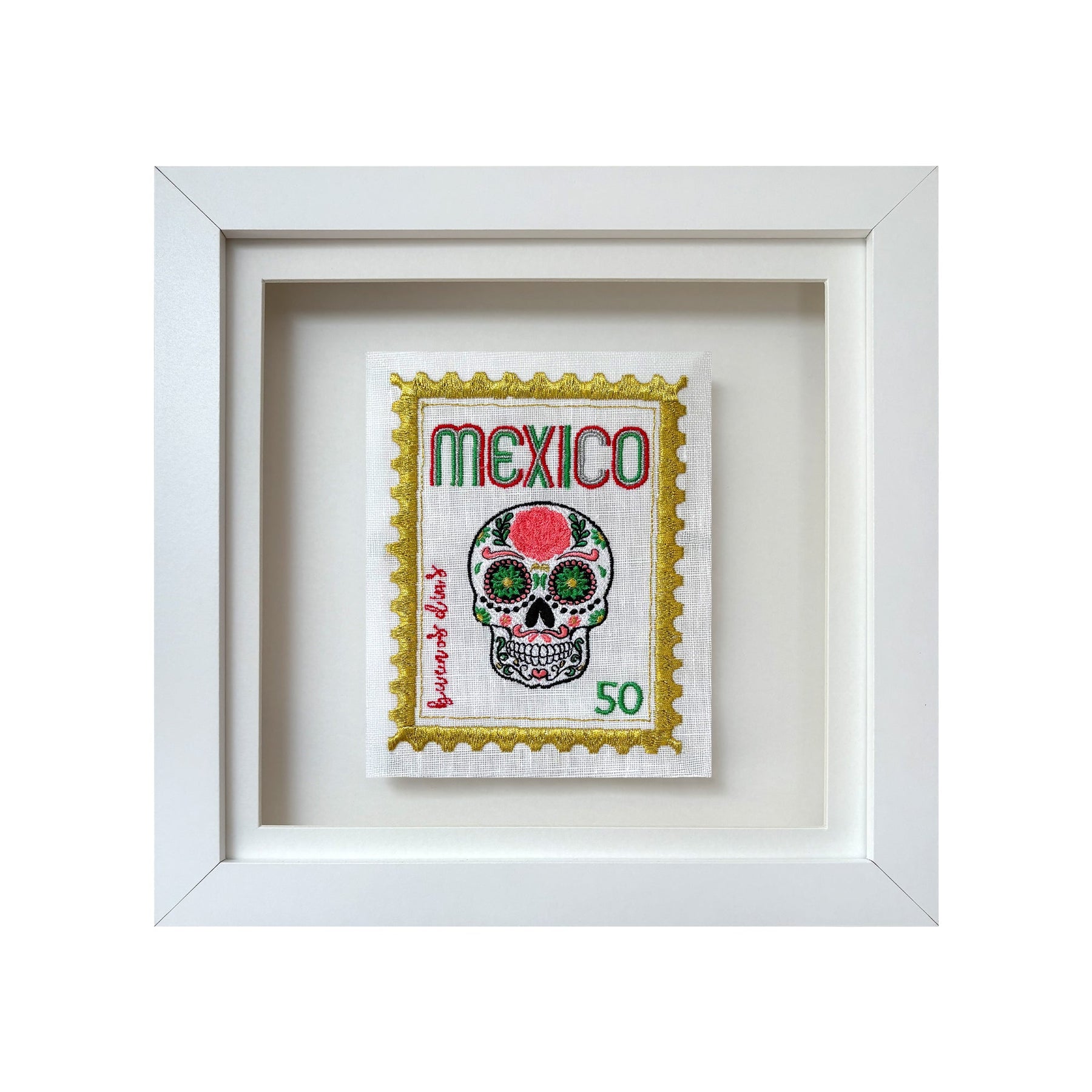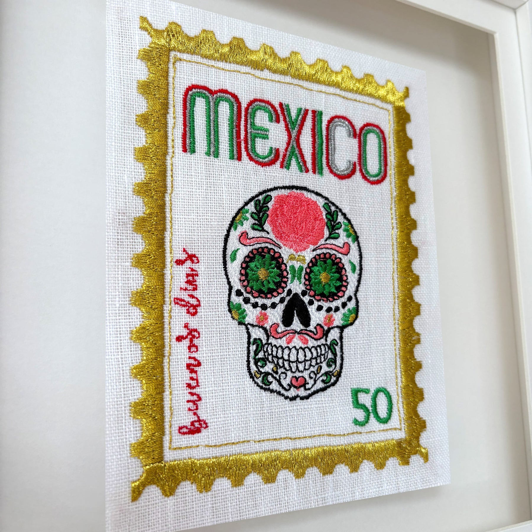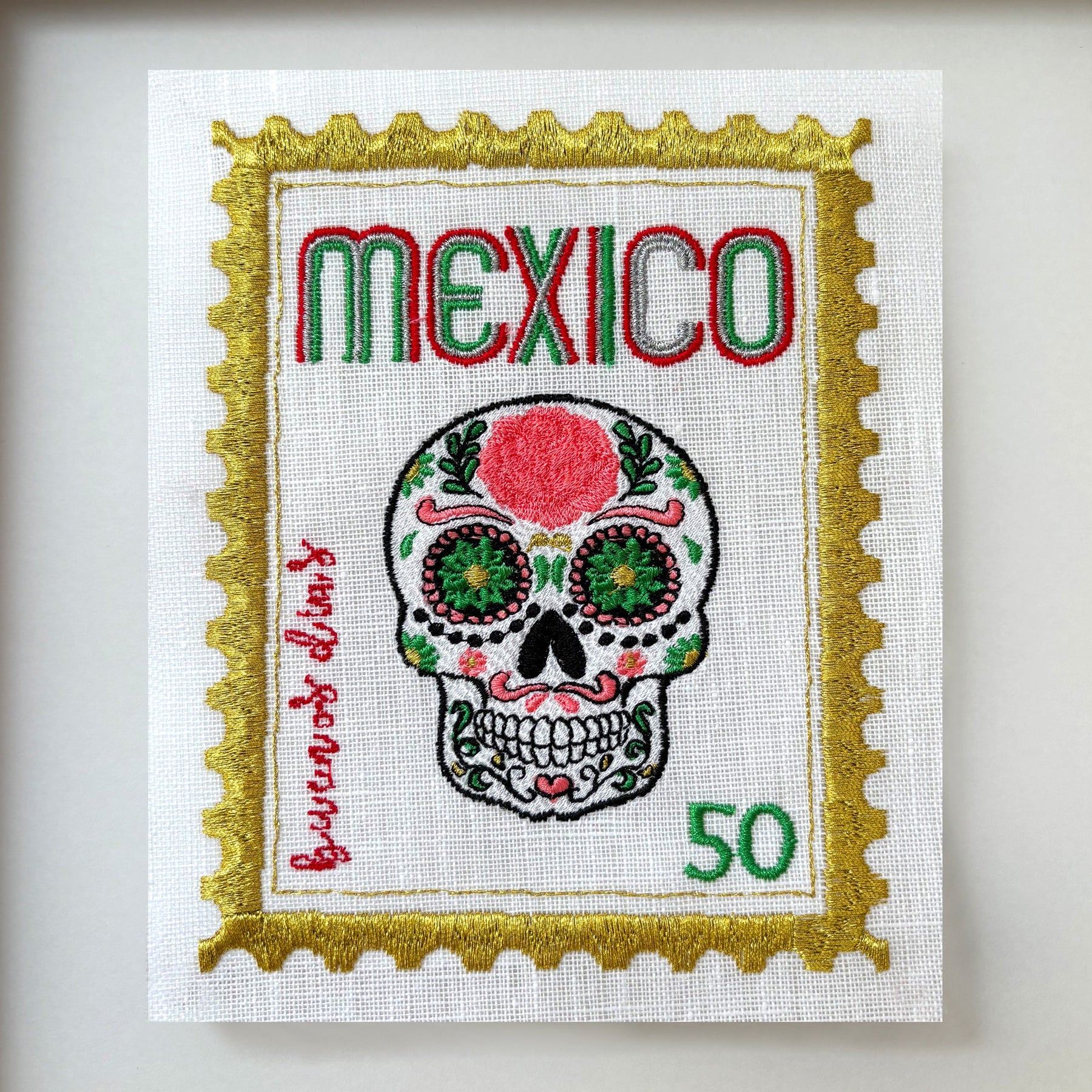 I wanted to create a range of unique embroidered stamps from all over the world, I love the colours on this design, Mexico; these are bright and fun with a playful twist. We stitch all of these in our London studio and use beautiful floating frames.