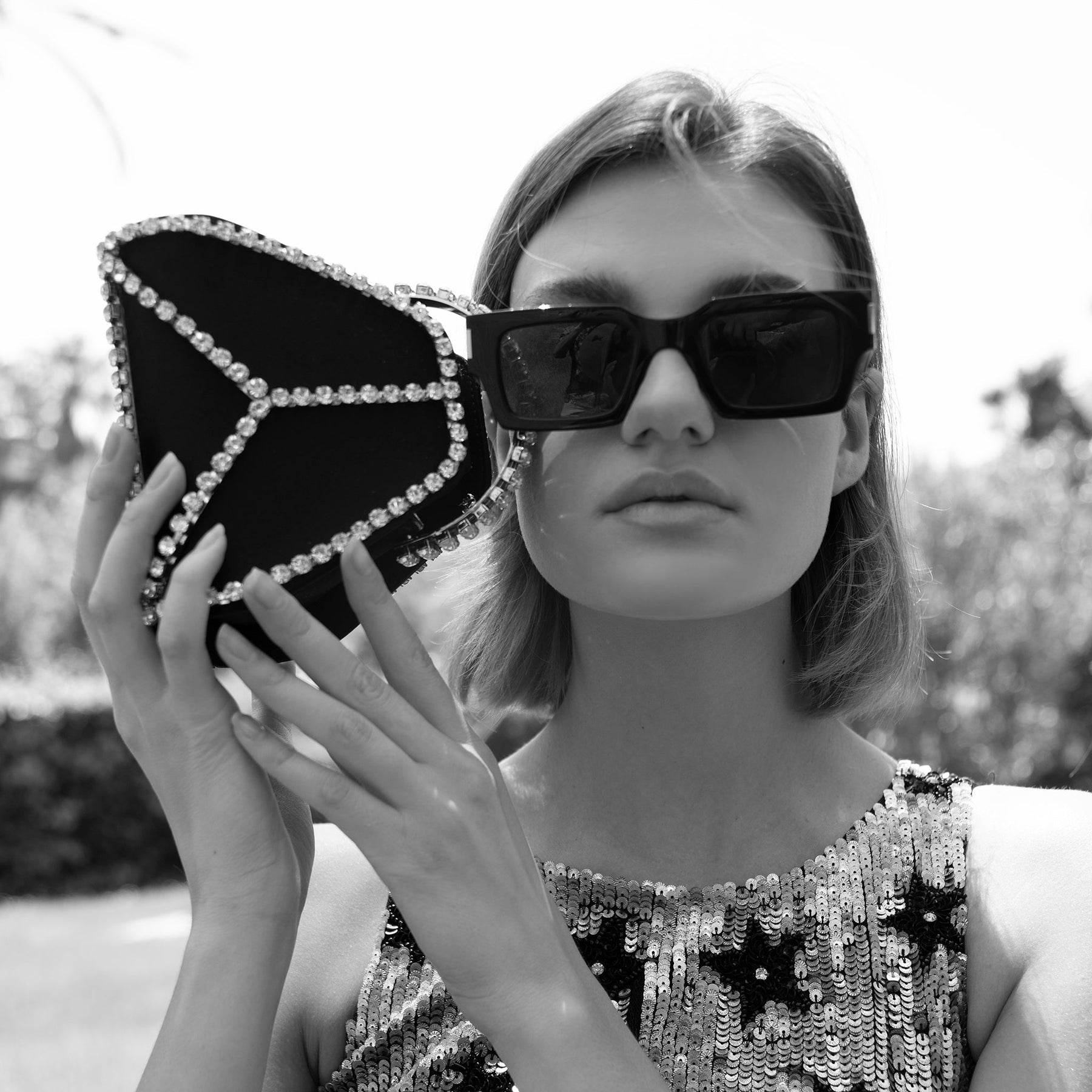 Black and white close-up of Cleo Mini Strass Black crystal bag held by model wearing sunglasses
