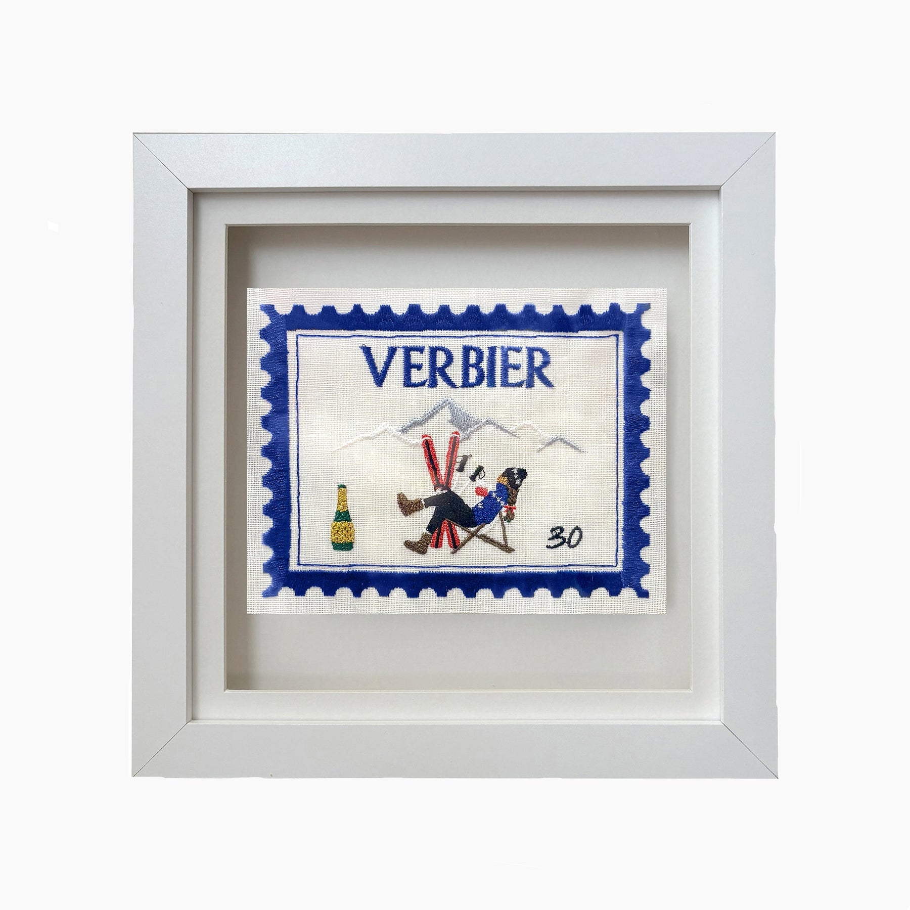 Verbier Embroidered Stamp Artwork captures the essence of this iconic Alpine village through intricate hand-embroidered detail. Each piece is meticulously crafted by hand, combining traditional embroidery techniques with a contemporary stamp-inspired design. The result is a unique textile artwork that celebrates Verbier's mountain heritage with texture and depth that print alone cannot achieve.
