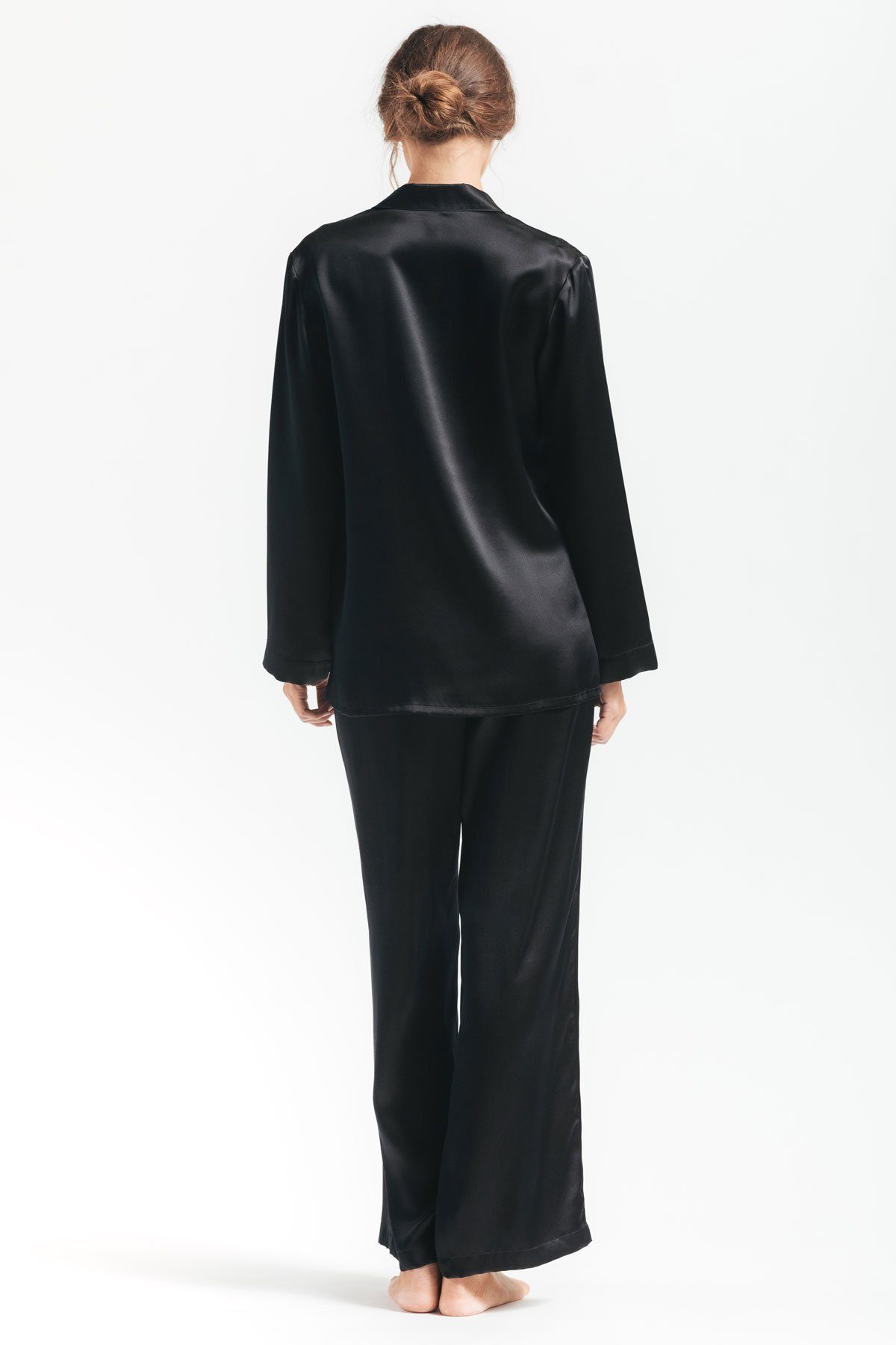 Backview of model wearing Morgan womens silk pajama set in black