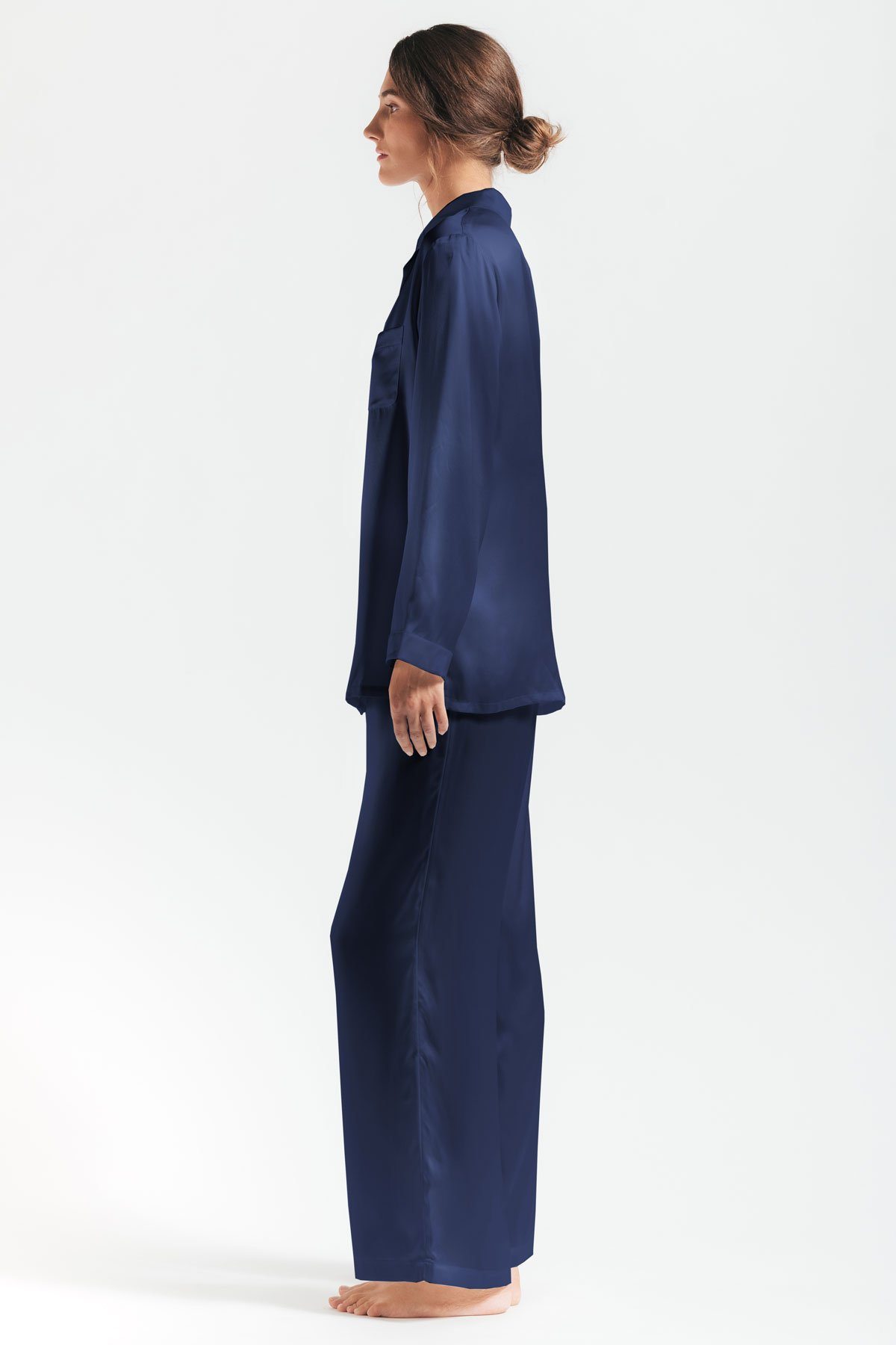 Sideview of model wearing Morgan womens silk pajama set in evening-blue