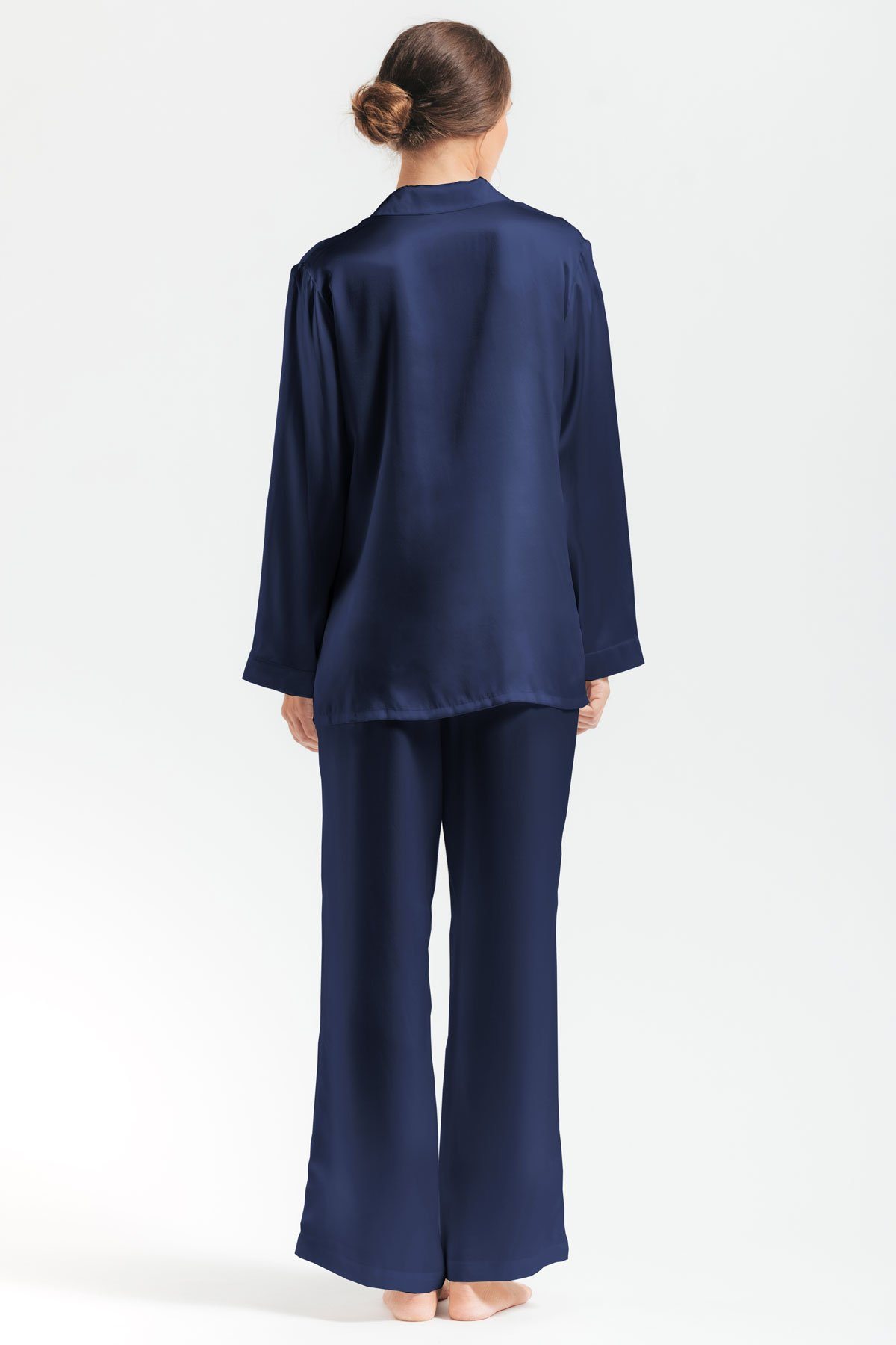 Backview of model wearing Morgan Silk pajama set in evening-blue