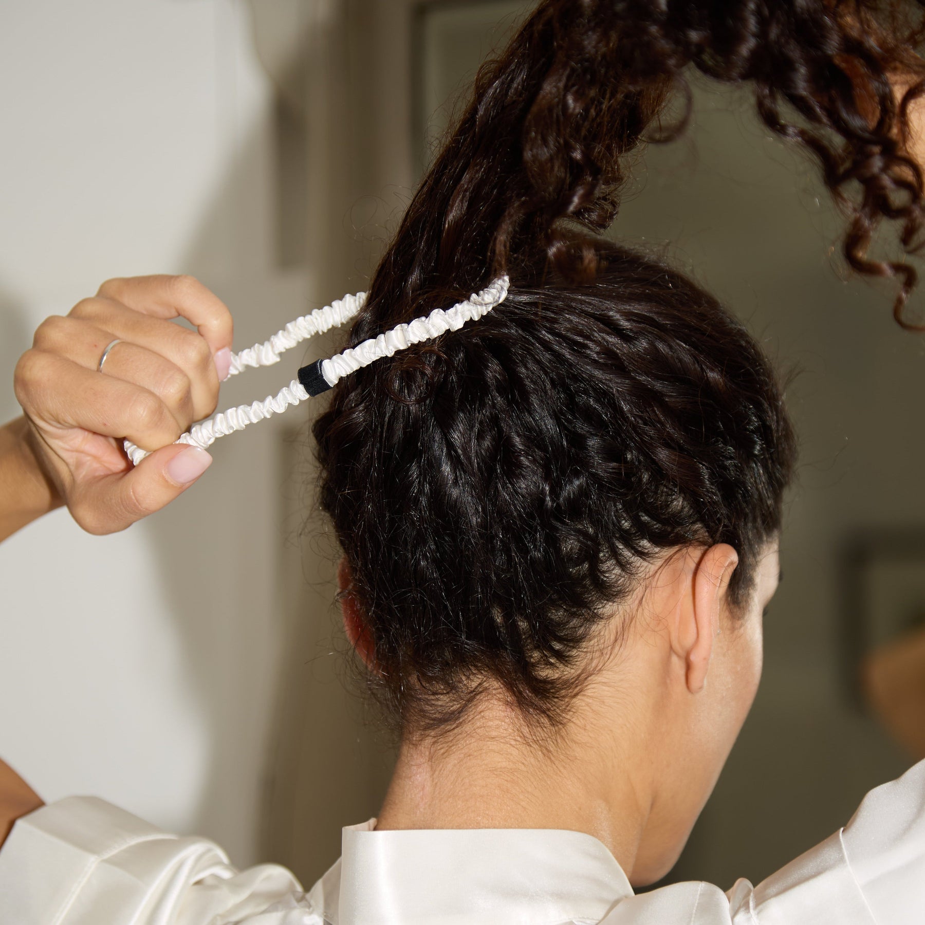 Lady with a white skinny mulberry silk scrunchie in hair.
