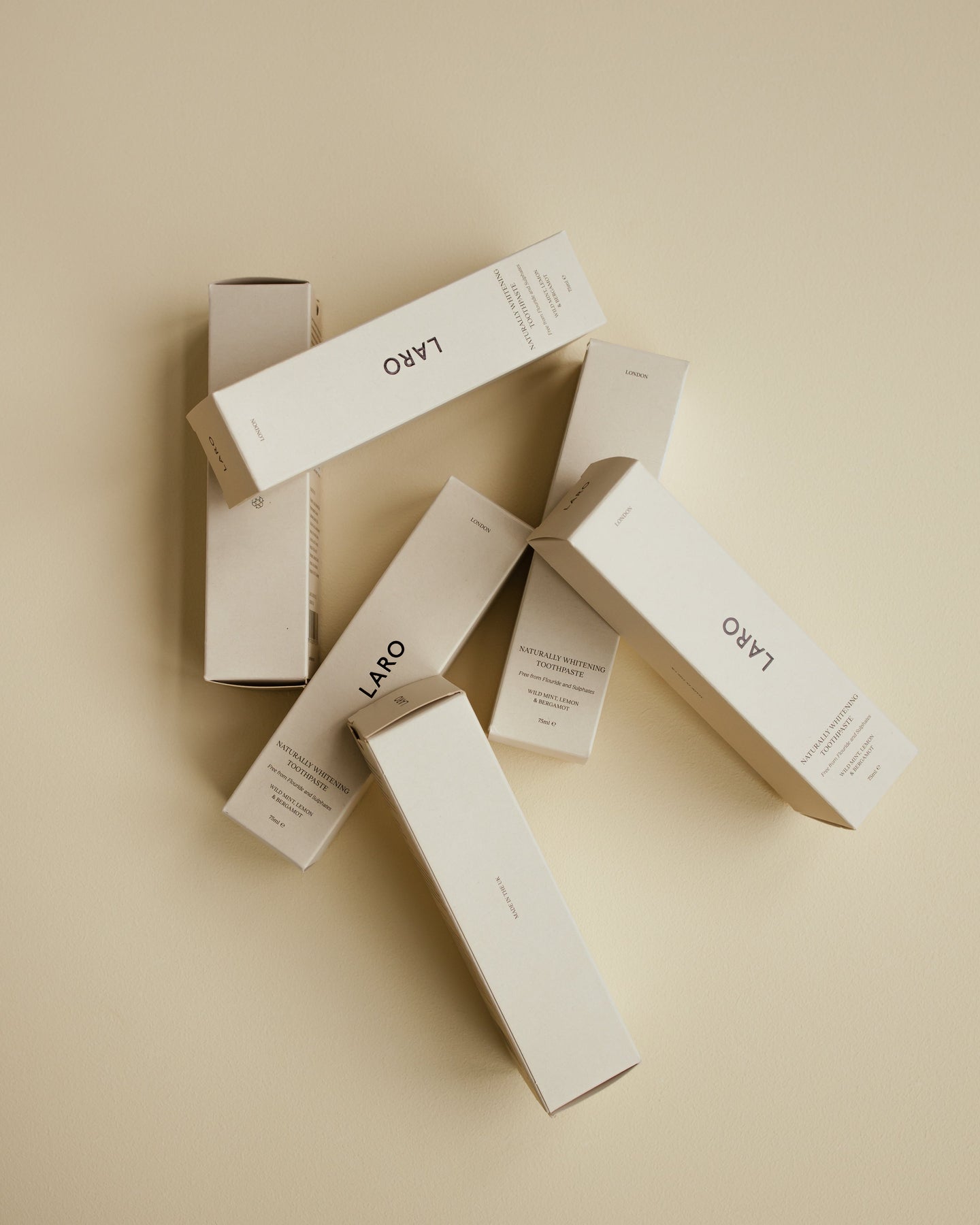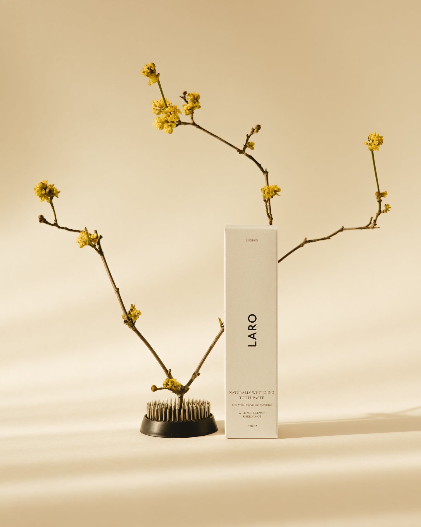 Naturally Whitening Toothpaste product packaging carton for Laro describing our SLS and fluoride free toothpaste, next to an ikebana with yellow flowering branch.