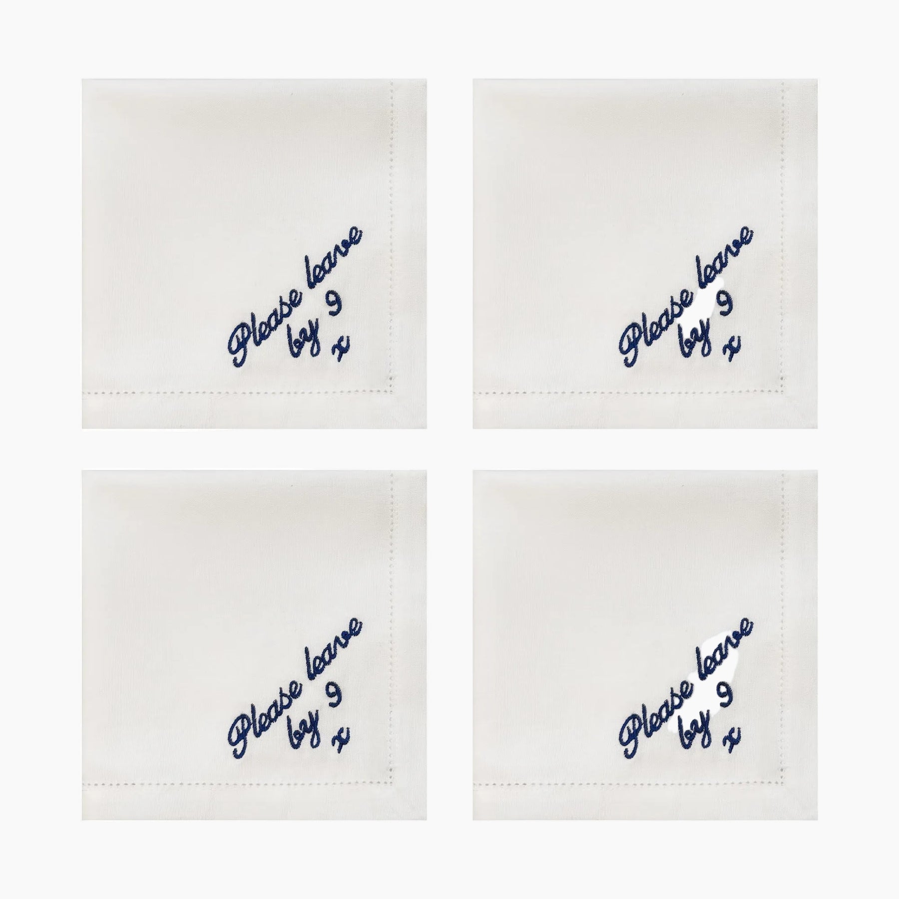 Add a personal touch of elegance to your dining experience with our Minimalistic Custom Fabric Napkin Set! Each set includes durable linen cloths expertly embroidered with your custom message, like 'Please Leave By 9', for a unique charm at your dinner table. Made with high-quality linen, these napkins are perfect for everyday use or special occasions, adding a minimalistic and playful touch to any table decor. Surprise your guests with some humor or delight a newlywed couple with a one-of-a-kind gift that's sure to be cherished. Make every meal memorable with our Embroidered Custom Fabric Towel Set!